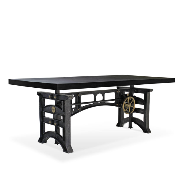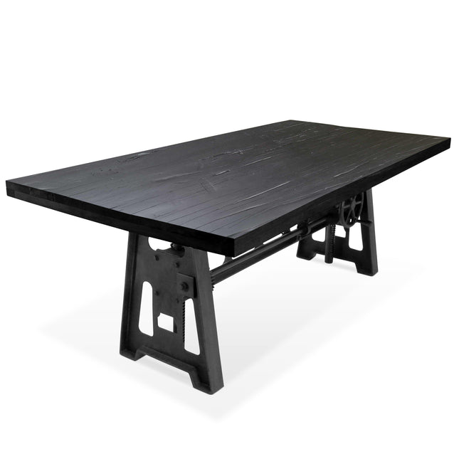 Industrial dining tables feature heavy cast iron bases and machine-age inspired elements that create a bold, authentic look. Many include functional features like adjustable height cranks that combine practical functionality with distinctive industrial aesthetics.