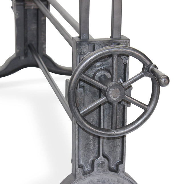 Inspired by the newspaper boon of the early 1800's, the Frederic table design is a unique mix of American Revival (curves of the base feet) and industrial machinery of that era (cast iron and crank wheel). This design takes its name from the Frederic Post Company located in Chicago, IL. The Frederick Post Company was a manufacturing leader of drafting tables and related factory workbenches during this period of US history.
