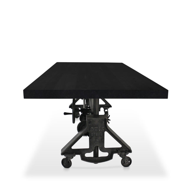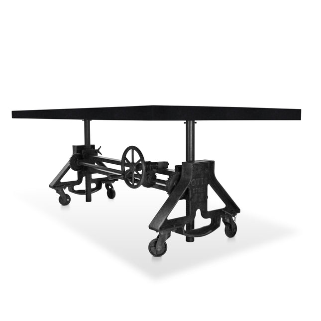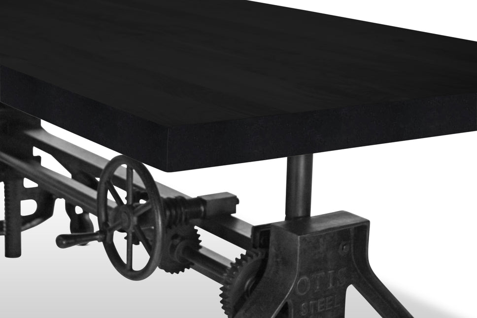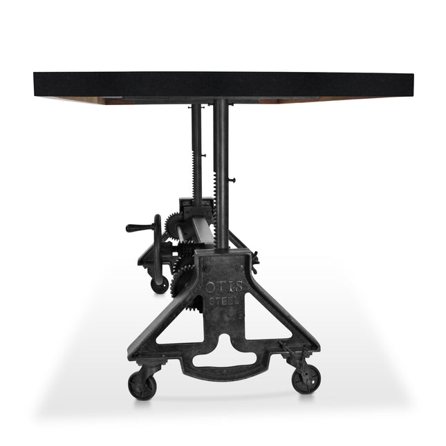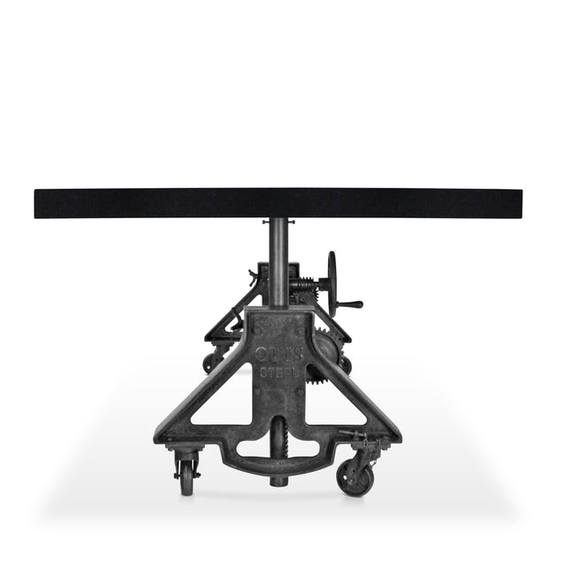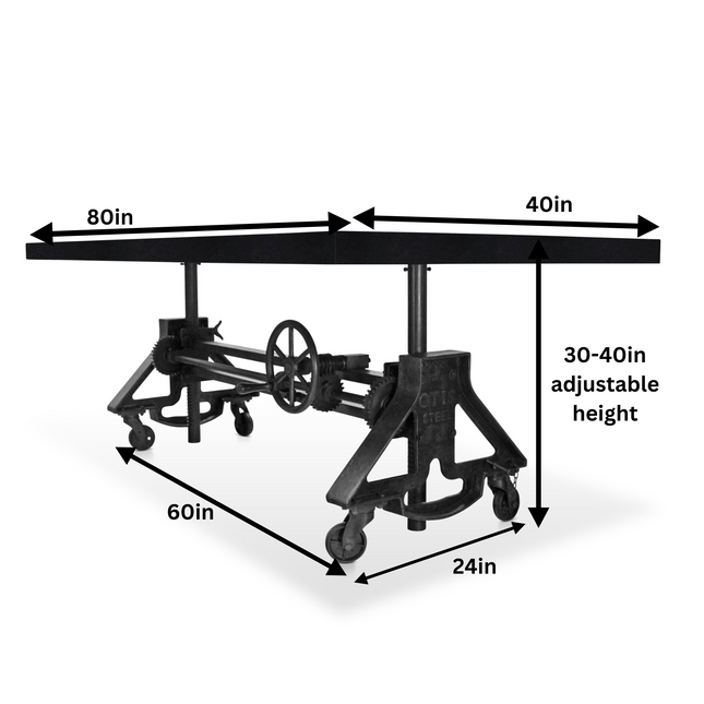 The base moves smoothly through a range of 29.5 to 39.5 inches - dining to pub height - via a hand cranked gear mechanism. For mobility, this table base includes heavy-duty iron-wheel casters that use a vintage-style manual lever to lock wheels in place. Adding to its vintage-industrial character, the cast iron ends of each table base is embossed with "OTIS STEEL". This very robust and unique design is multi-functional as a dining table, pub table, kitchen island, writing table, or desk and accommodates heavy tabletops in a variety of finishes and decorating styles.