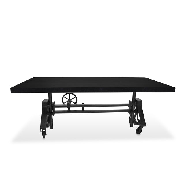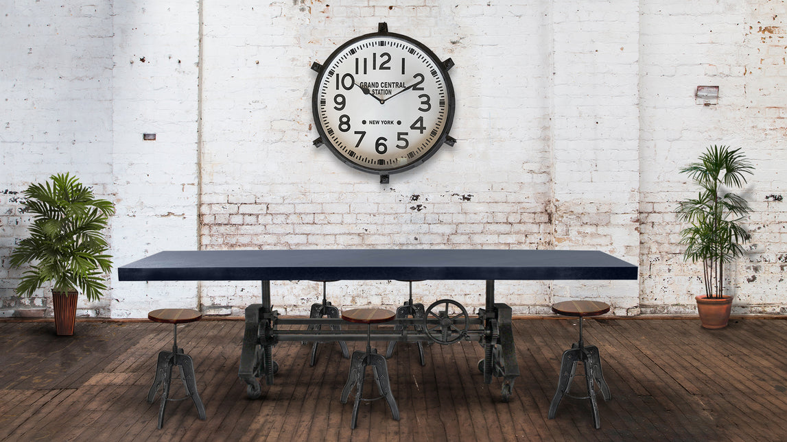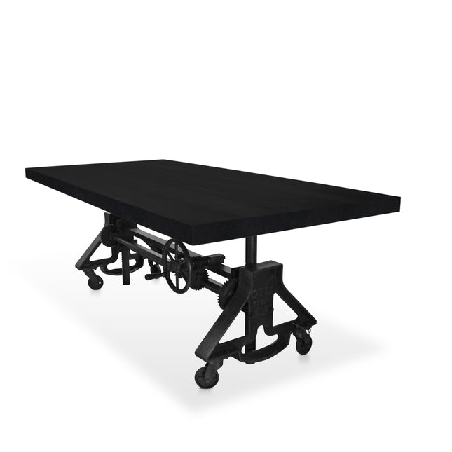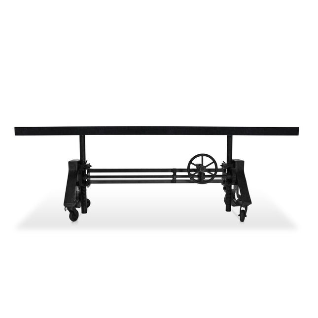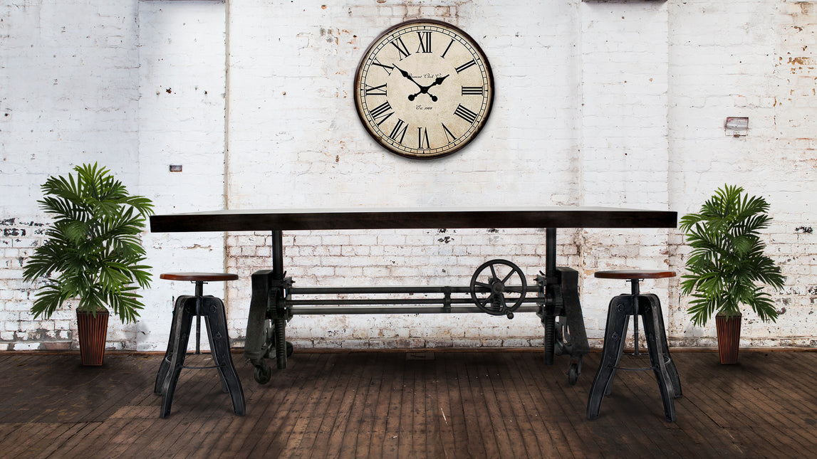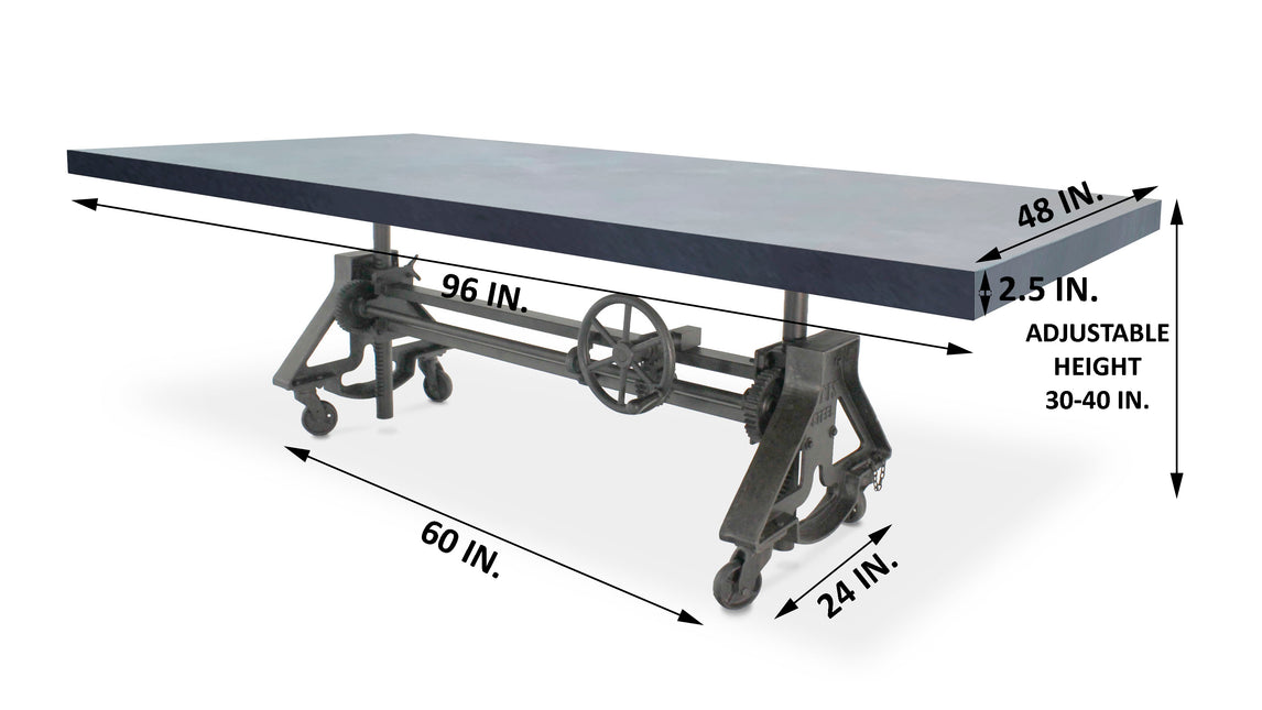 The base moves smoothly through a range of 29.5 to 39.5 inches - dining to pub height - via a hand cranked gear mechanism. For mobility, this table base includes heavy-duty iron-wheel casters that use a vintage-style manual lever to lock wheels in place. Adding to its vintage-industrial character, the cast iron ends of each table base is embossed with "OTIS STEEL". This very robust and unique design is multi-functional as a dining table, pub table, kitchen island, writing table, or desk and accommodates heavy tabletops in a variety of finishes and decorating styles.
