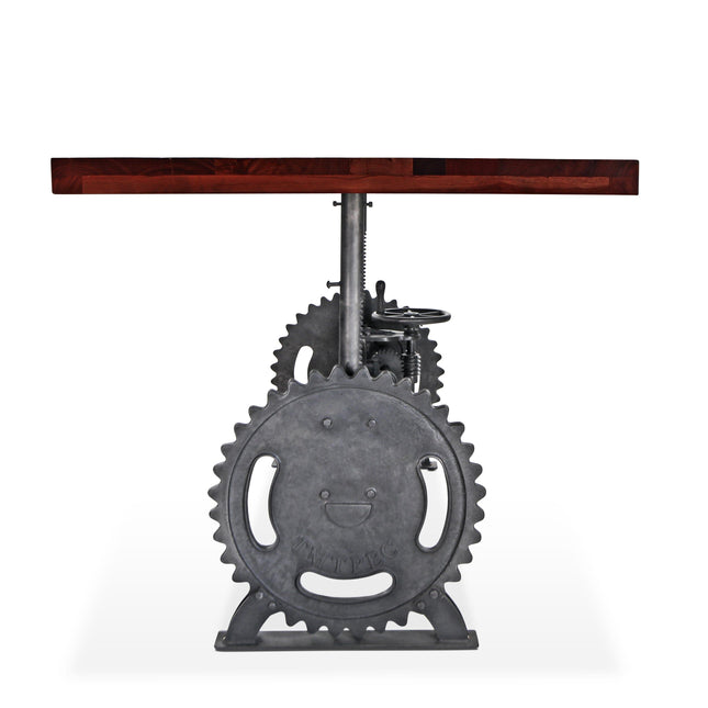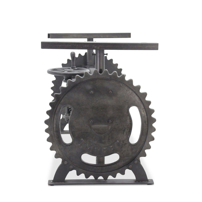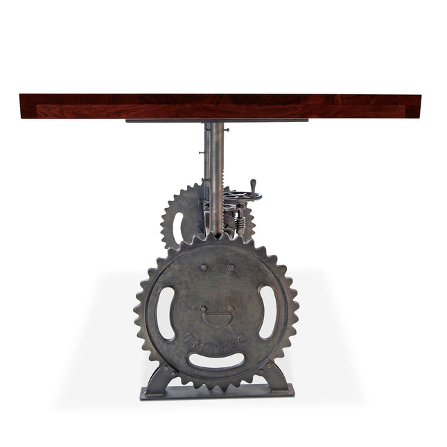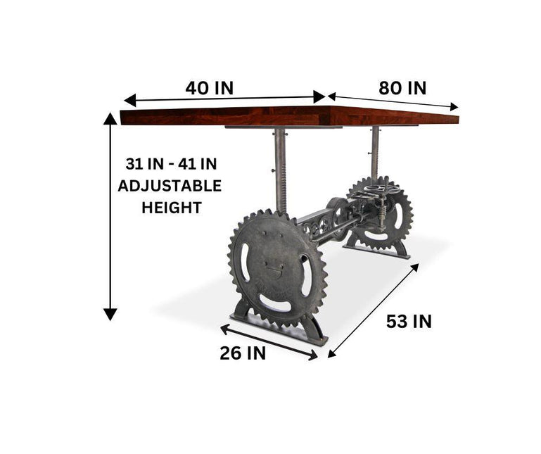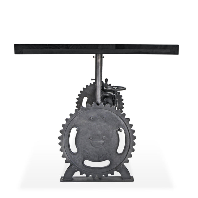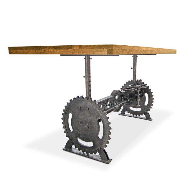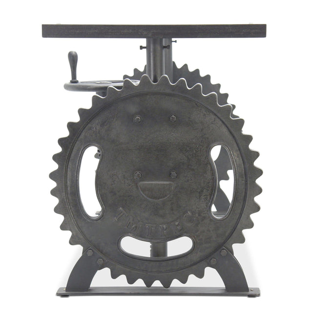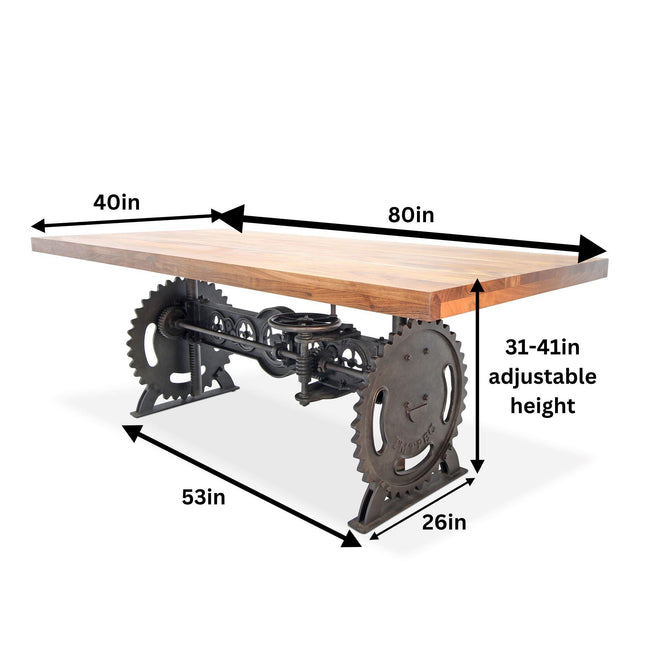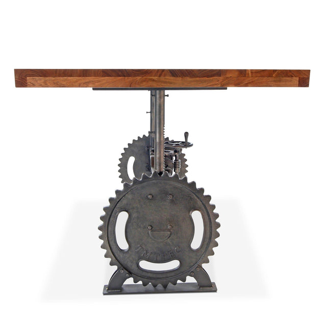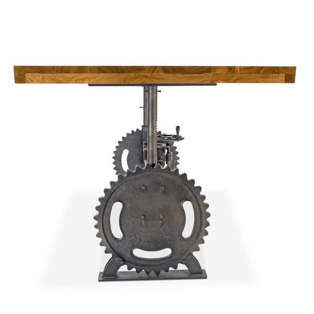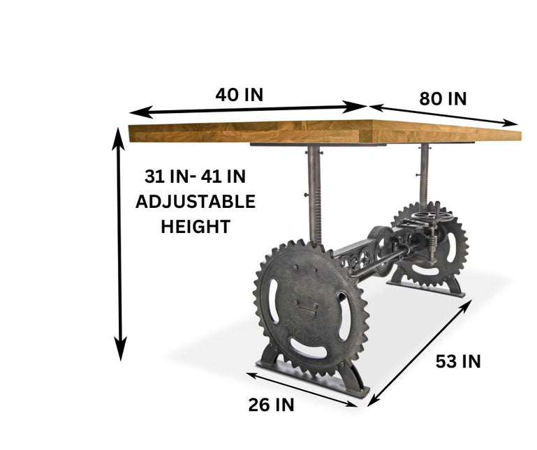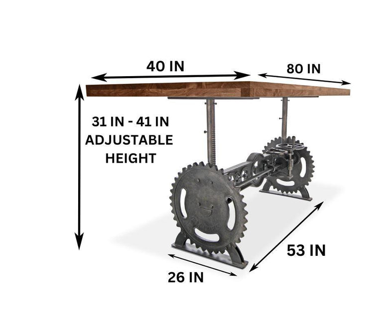 Via mechanical hand-cranked wheel, the table height is easily adjustable over a 10-inch range, allowing it to be utilized at standard dining height, counter height, or bar height. This rugged vintage industrial design is sturdy enough to support our massive solid hardwood tabletops, which come traditional smooth finishes, as well as, rustic weathered textures.