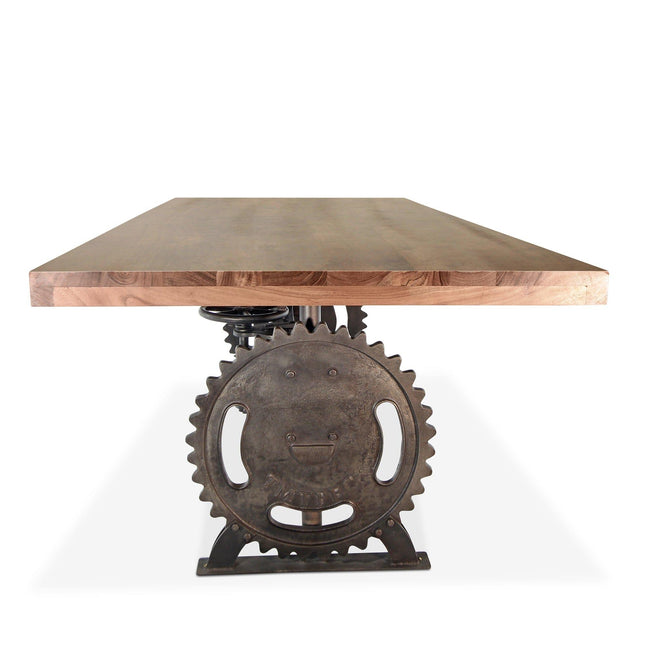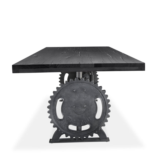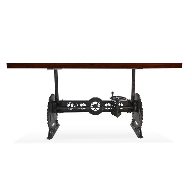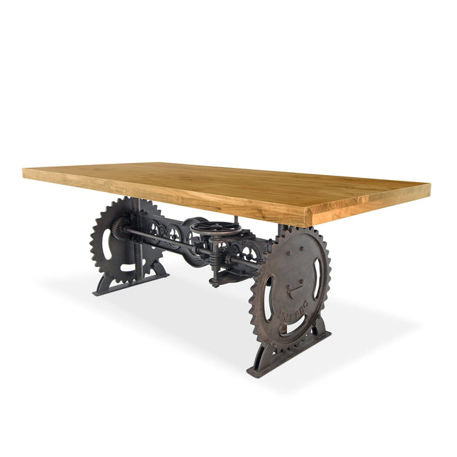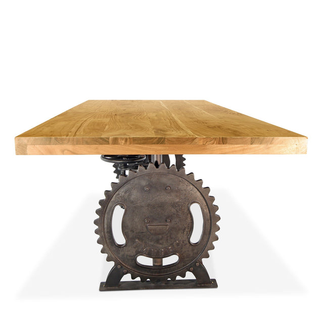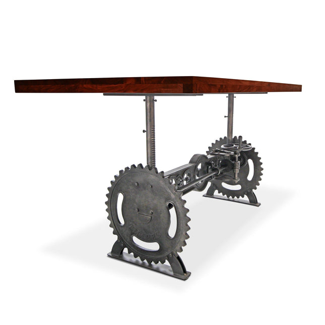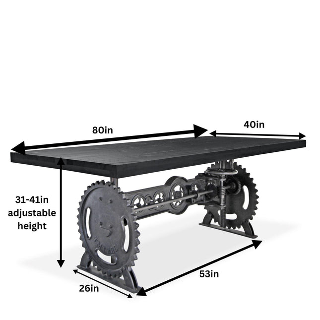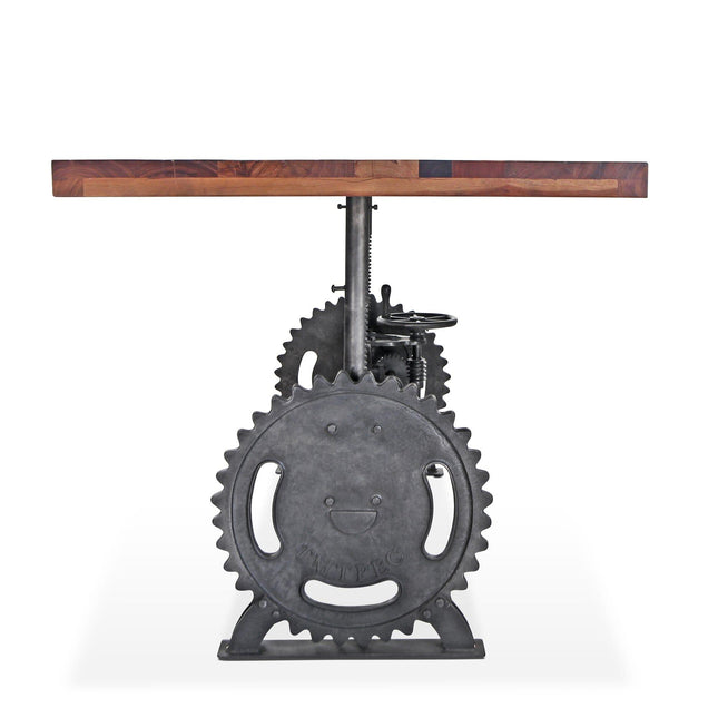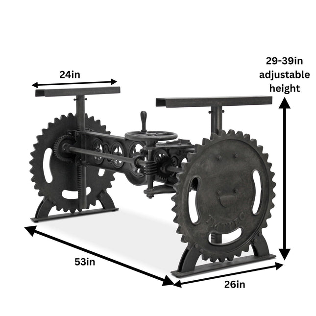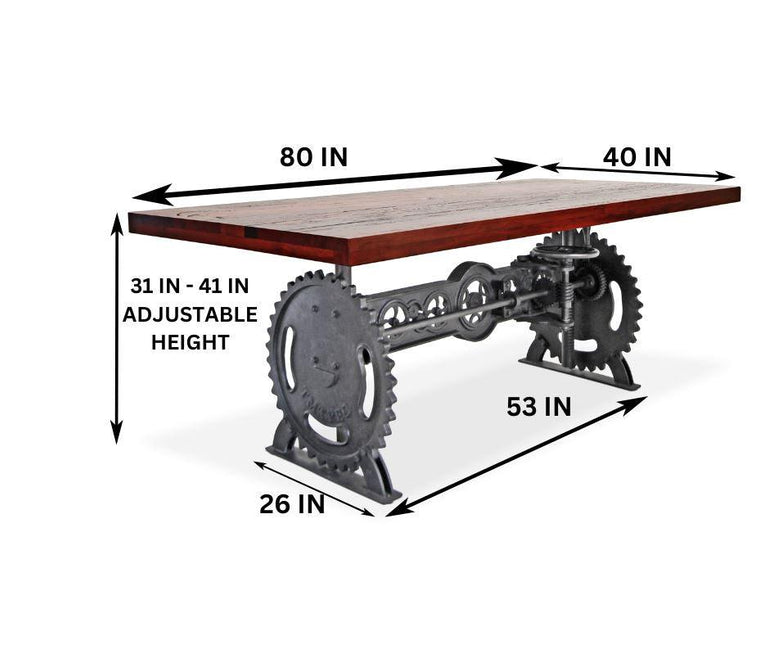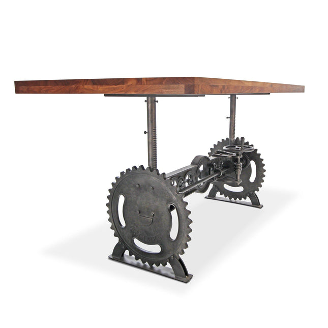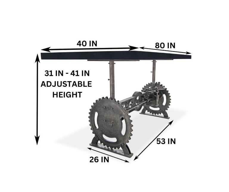 Via mechanical hand-cranked wheel, the table height is easily adjustable over a 10-inch range, allowing it to be utilized at standard dining height, counter height, or bar height. This rugged vintage industrial design is sturdy enough to support our massive solid hardwood tabletops, which come traditional smooth finishes, as well as, rustic weathered textures.