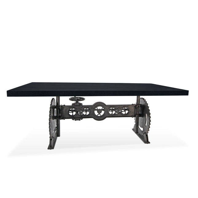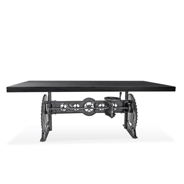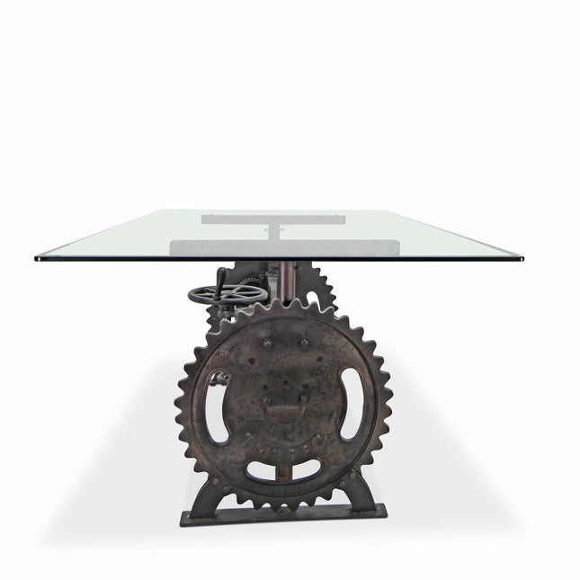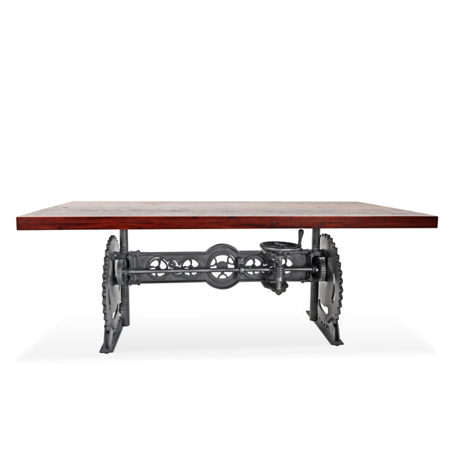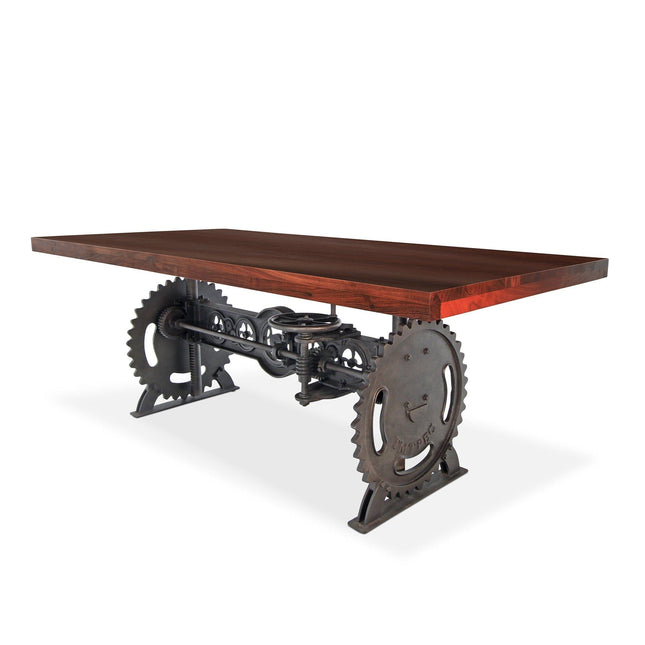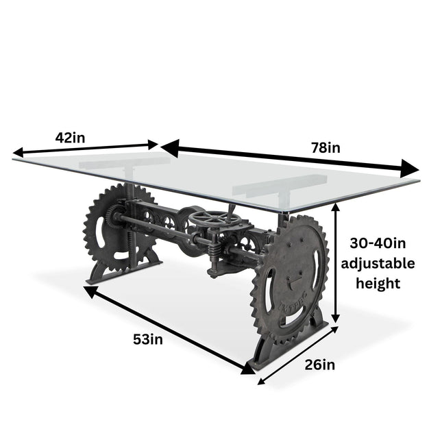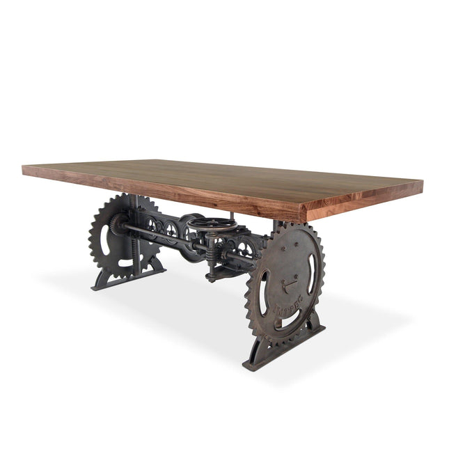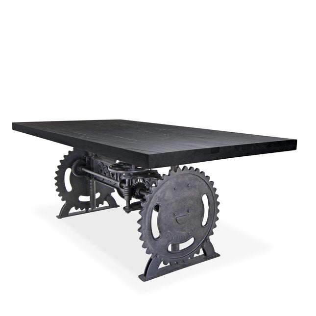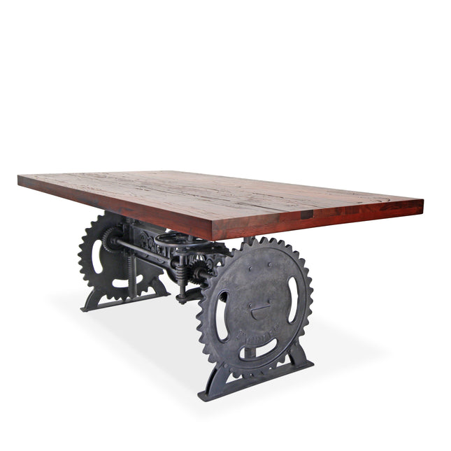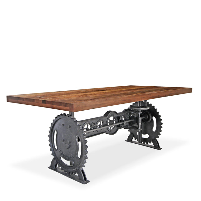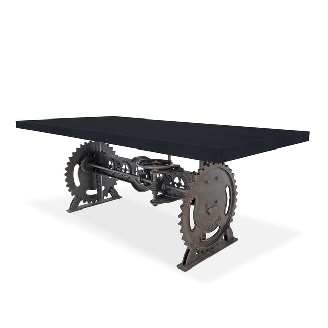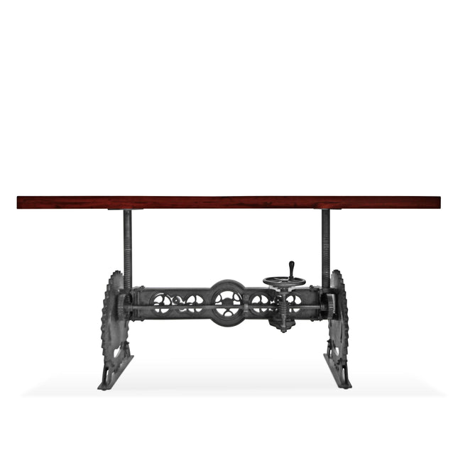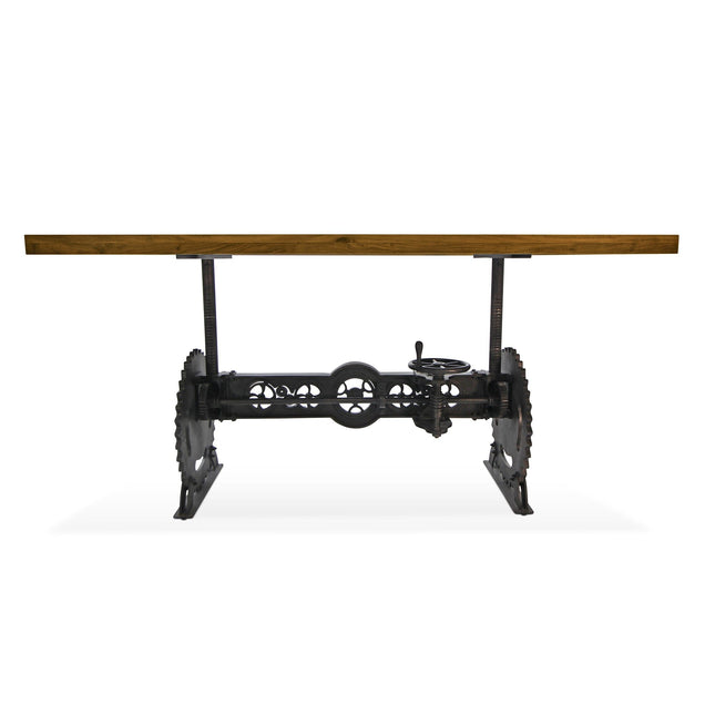 Via mechanical hand-cranked wheel, the table height is easily adjustable over a 10-inch range, allowing it to be utilized at standard dining height, counter height, or bar height. This rugged vintage industrial design is sturdy enough to support our massive solid hardwood tabletops, which come traditional smooth finishes, as well as, rustic weathered textures.