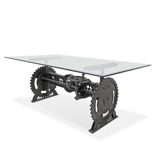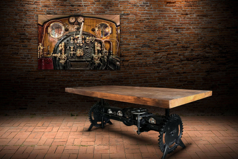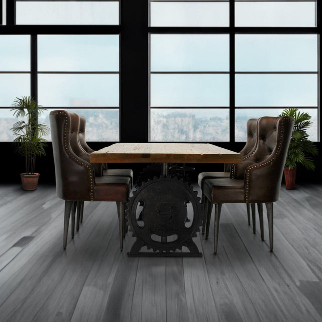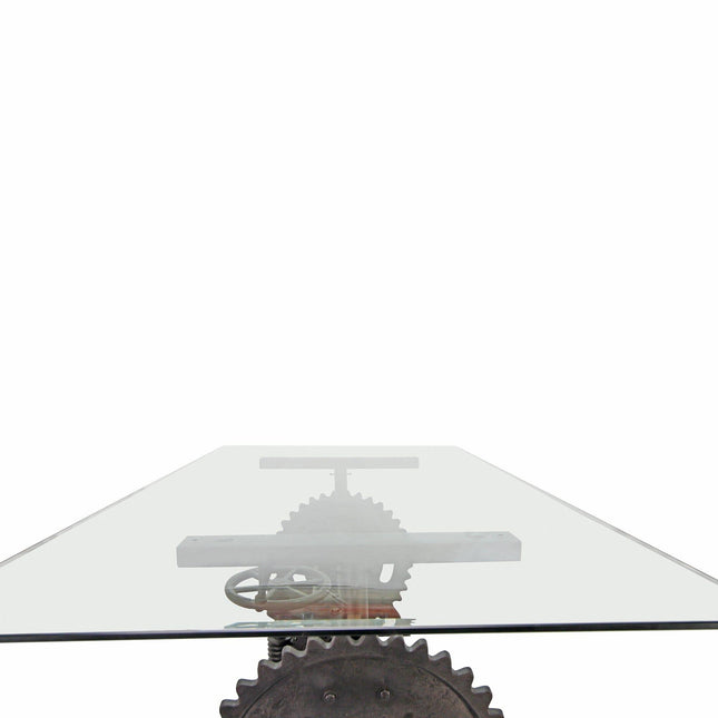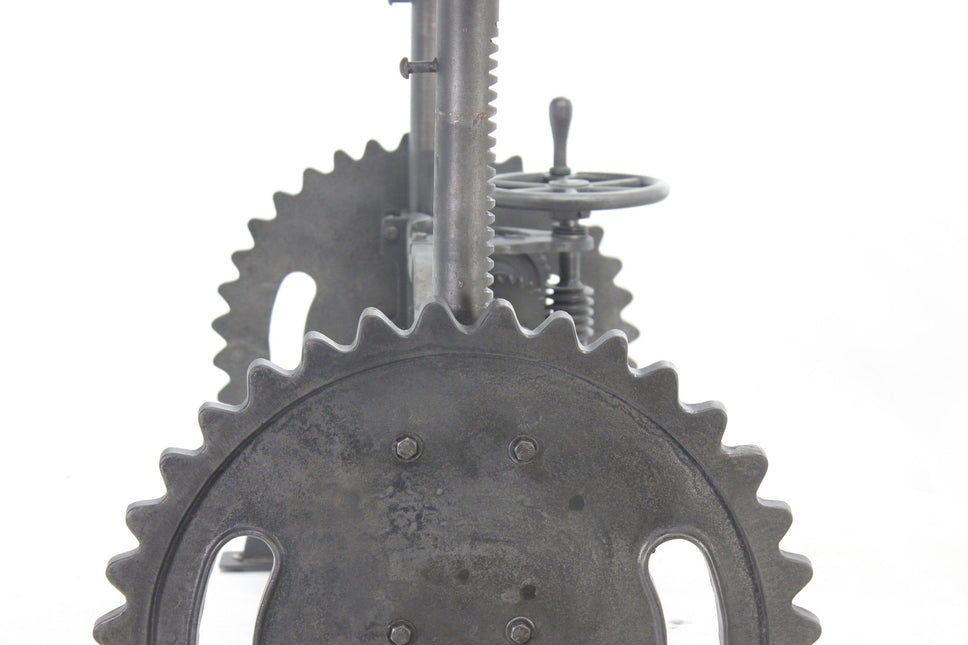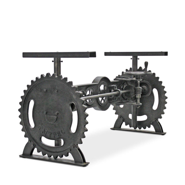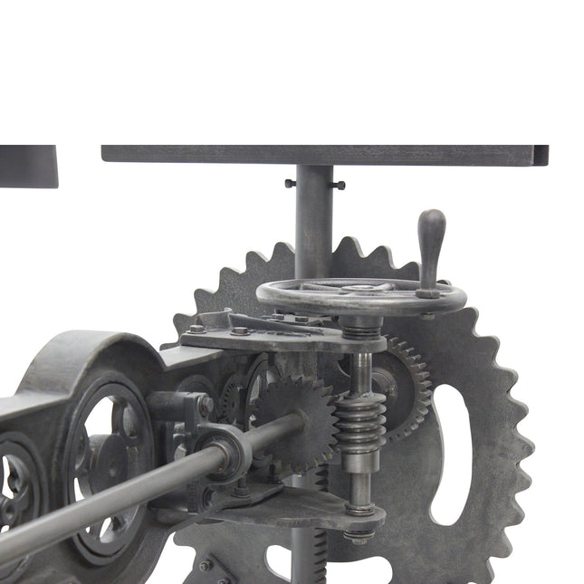 The steampunk style is derived from the retro futuristic romanticism of the late Victorian Era, during a time when mechanical fantasy was visualized through basic mechanical technology. Our Steampunk table designs embraces the machine and clockwork technology of that era through its cast iron framework interlaced with functional mechanical gears and sprockets. This wonderfully detailed design is a fusion of cast iron and carbon steel, creating a handcrafted, heirloom-quality, centerpiece.