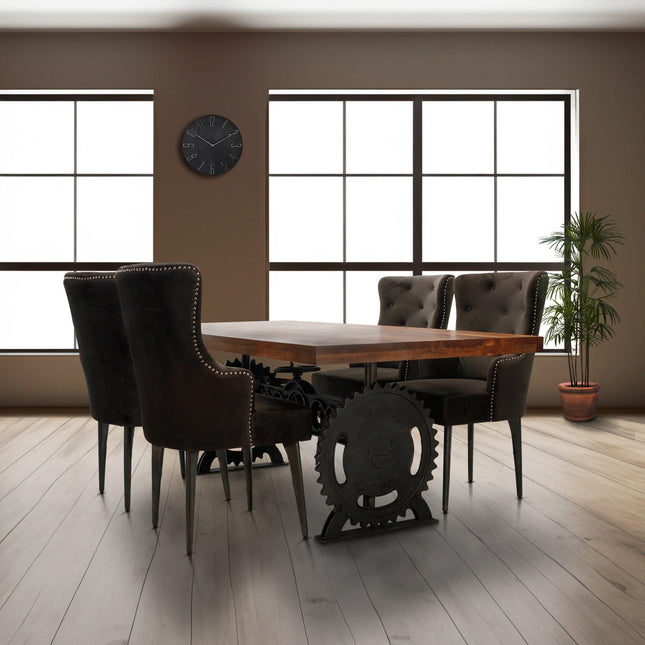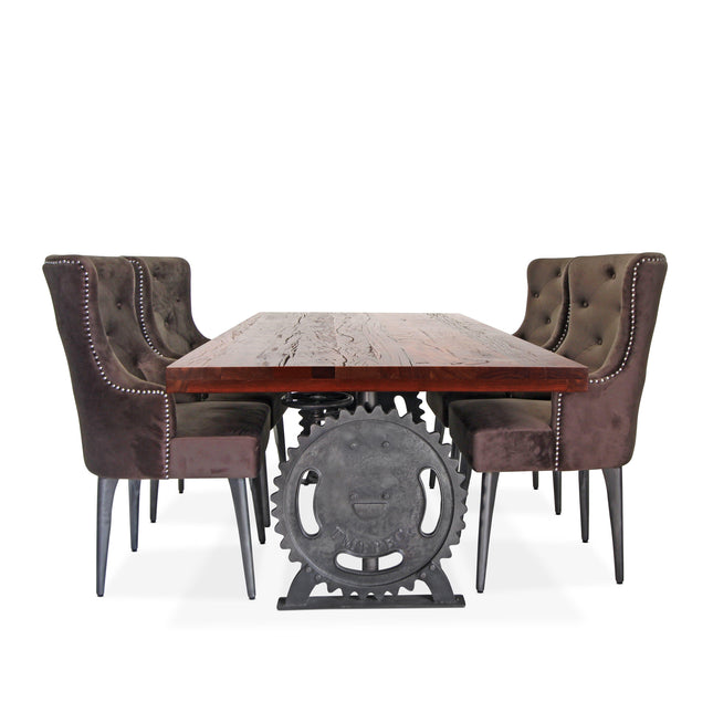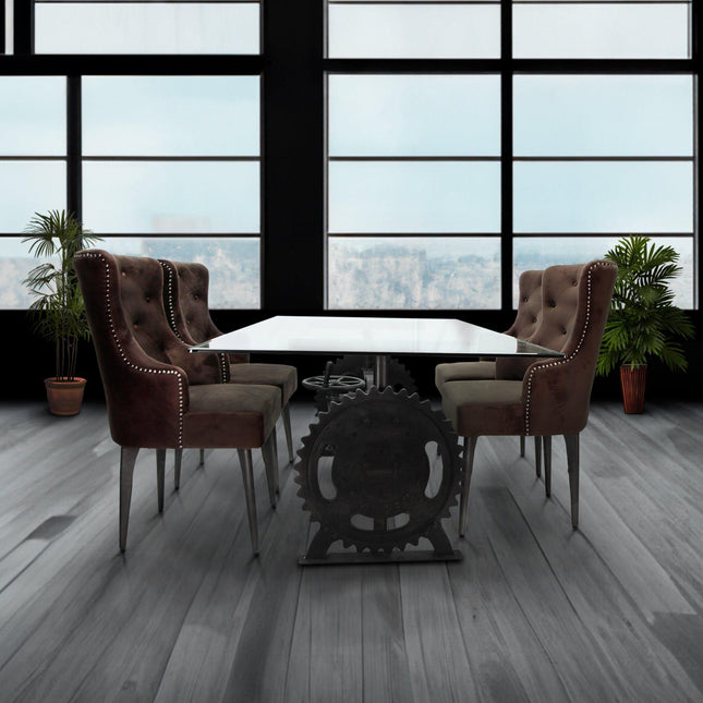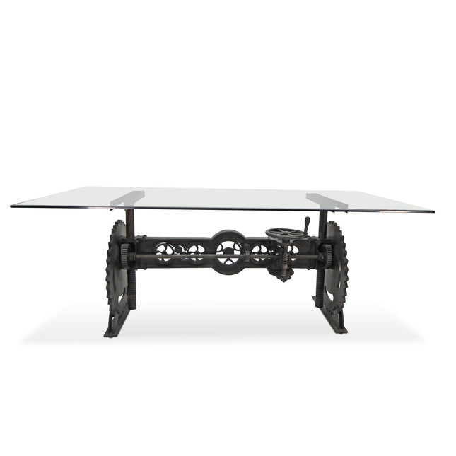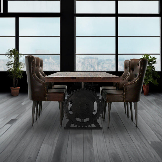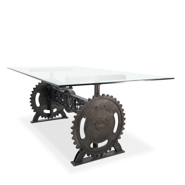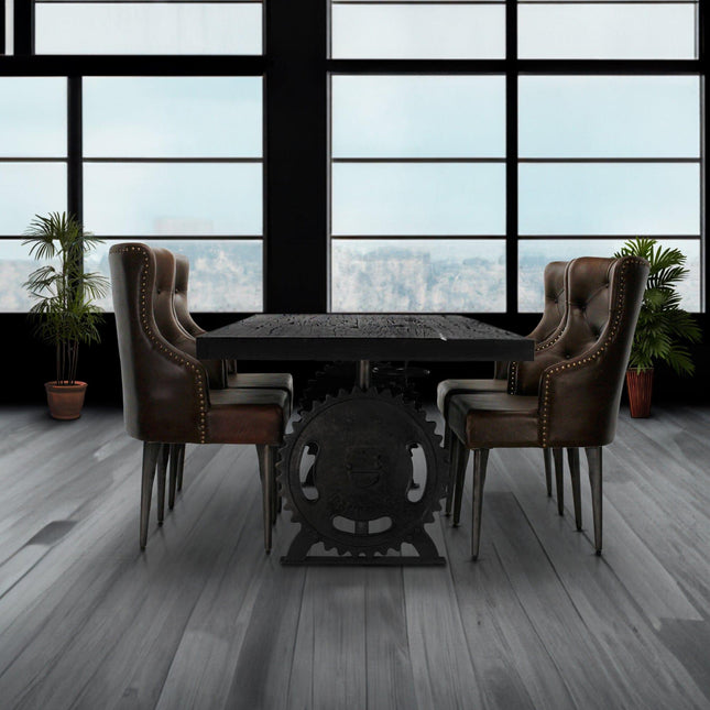 The steampunk style is derived from the retro futuristic romanticism of the late Victorian Era, during a time when mechanical fantasy was visualized through basic mechanical technology. Our Steampunk table designs embraces the machine and clockwork technology of that era through its cast iron framework interlaced with functional mechanical gears and sprockets. This wonderfully detailed design is a fusion of cast iron and carbon steel, creating a handcrafted, heirloom-quality, centerpiece.