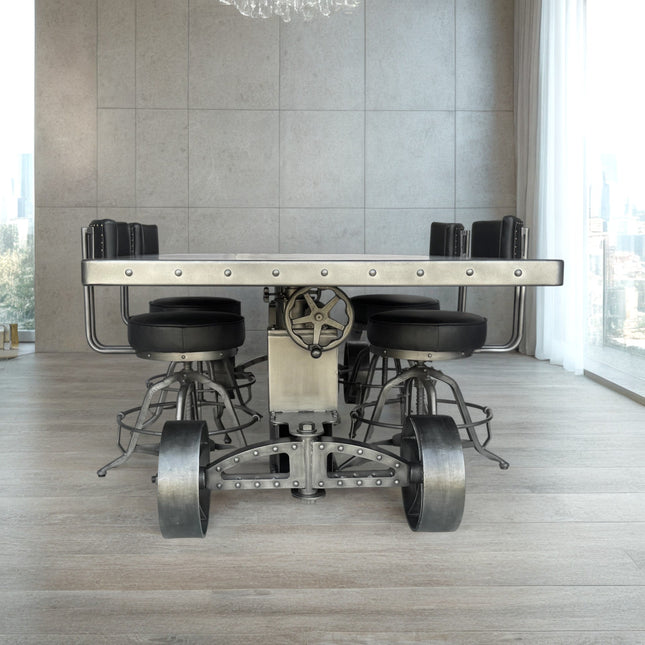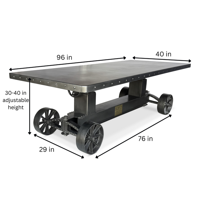The solid cast iron spoke wheels measure 12-inches tall and 4-inches across. These heavy-duty wheels bolt to an impressive dual axial-undercarriage and make moving this massive cast-iron table fast and simple. Offered in a variety of rustic, traditional, and modern tabletops, this magnificent table integrates well with many decorating styles, including vintage industrial, rustic, retro, cabin and western.