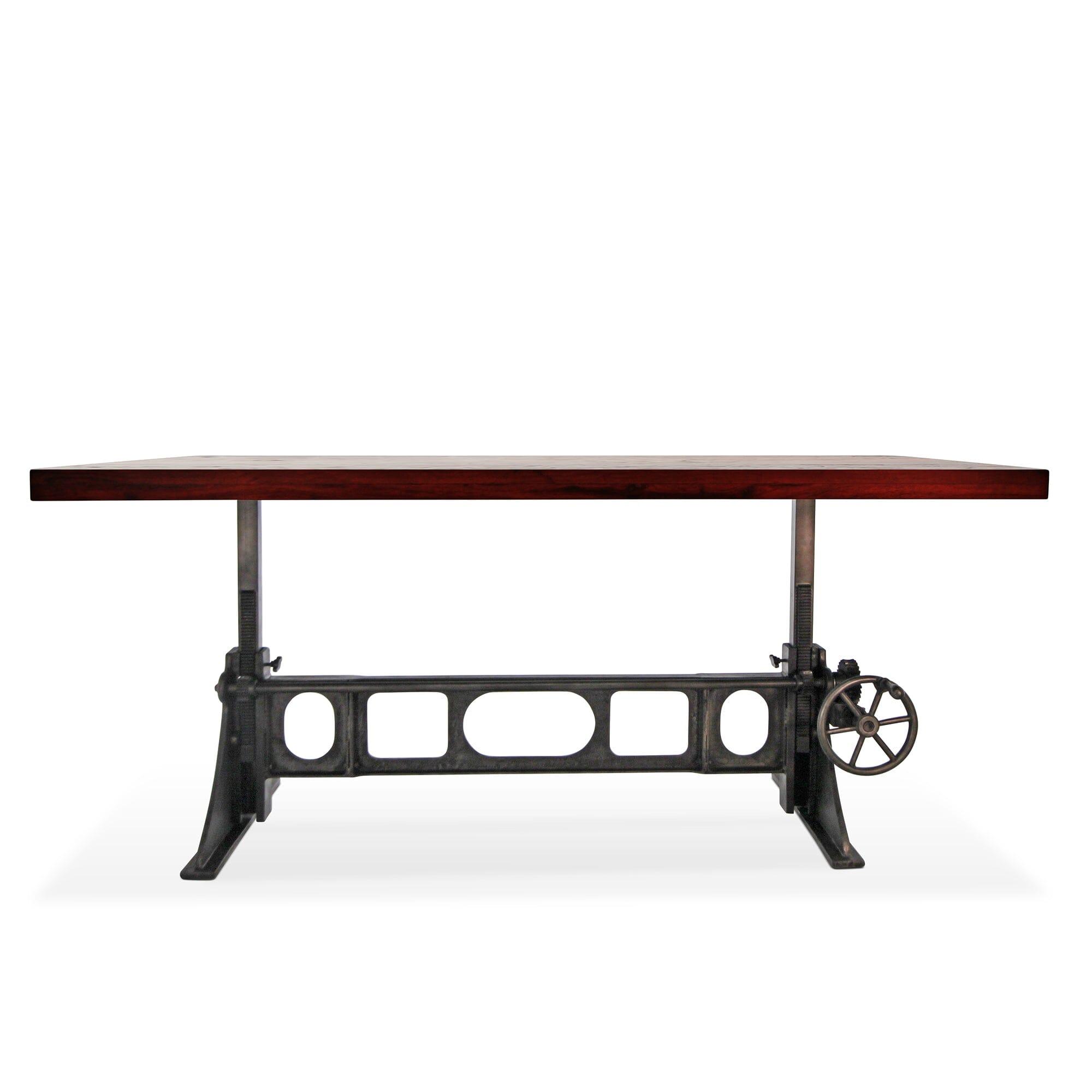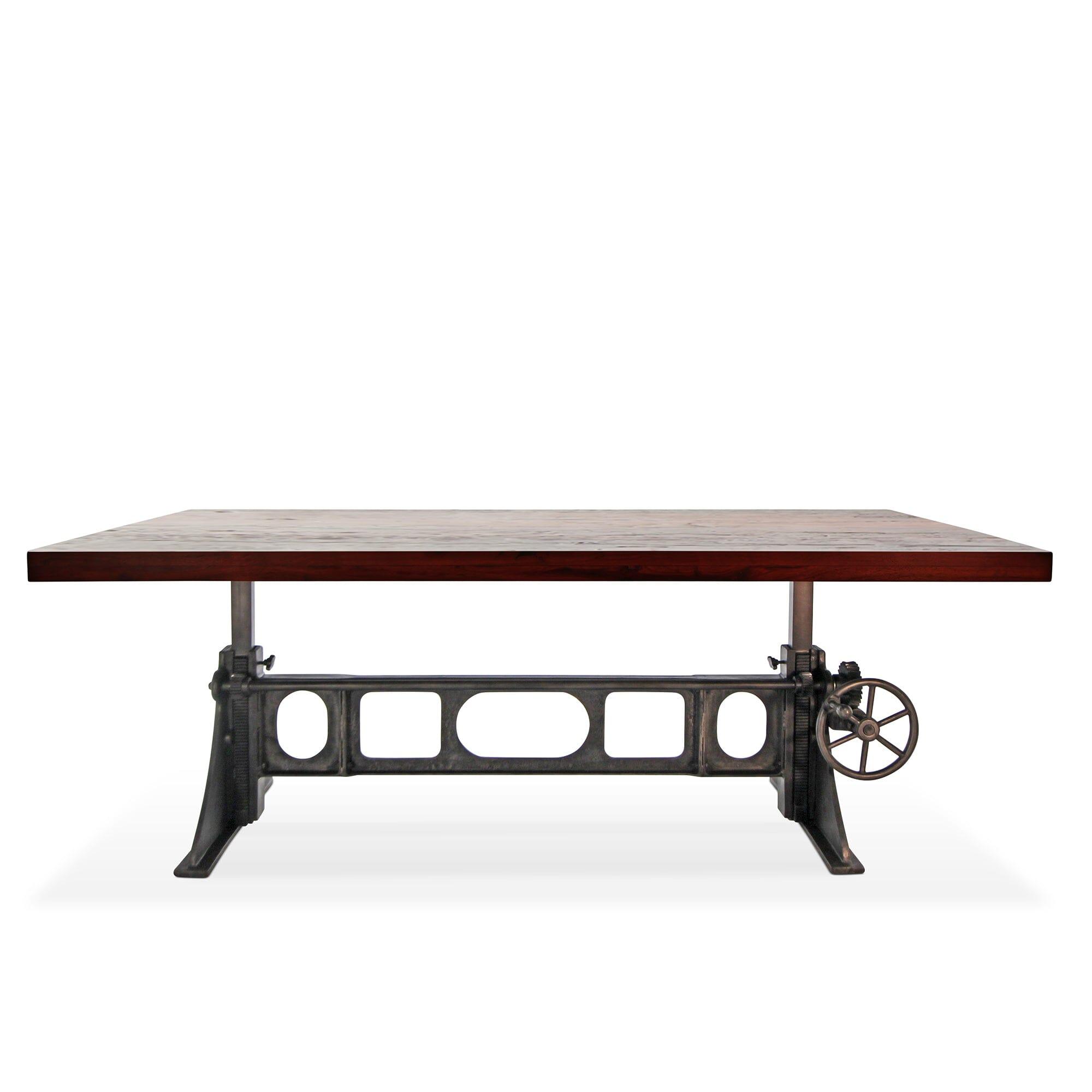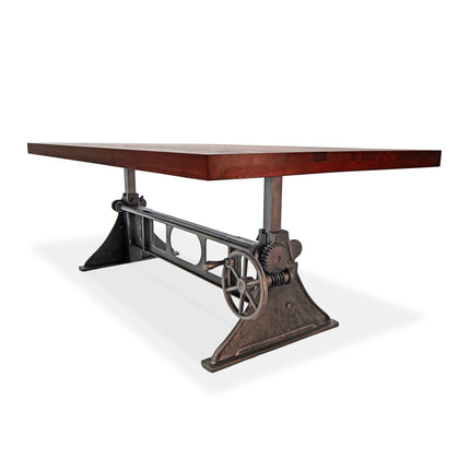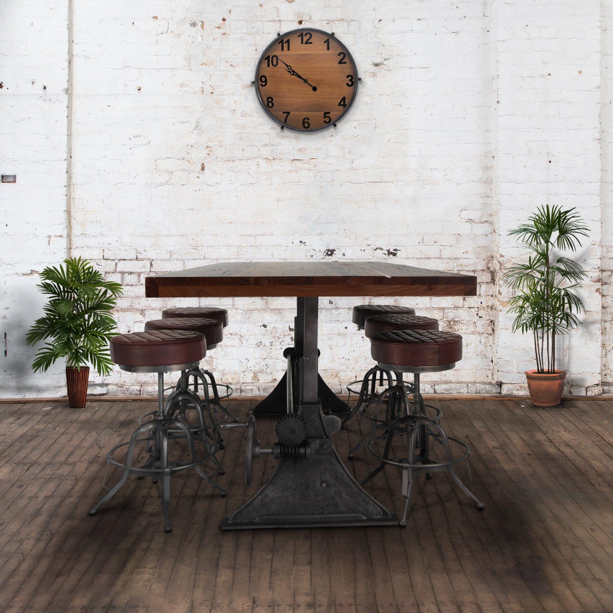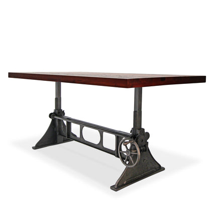 Cleverly designed, the vintage-style gearwork of this dining table embodies visual interest and industrial character. With an attractive curvature and smooth taper, this stylized triangular cast-iron base was inspired from the ancient Greek letter Delta, which is often used in engineering to symbolize changeability. The name is an excellent reflection of the versatile utility of this ergonomic sit-or-stand design. With a turn of the iron wheel, the spiral-helical gear mechanism smoothly adjusts the massive tabletop through an 11-inch range, from standard dining height to full bar height. The blackish distressed-iron finish of this base is amazing, further enhancing its mechanical character