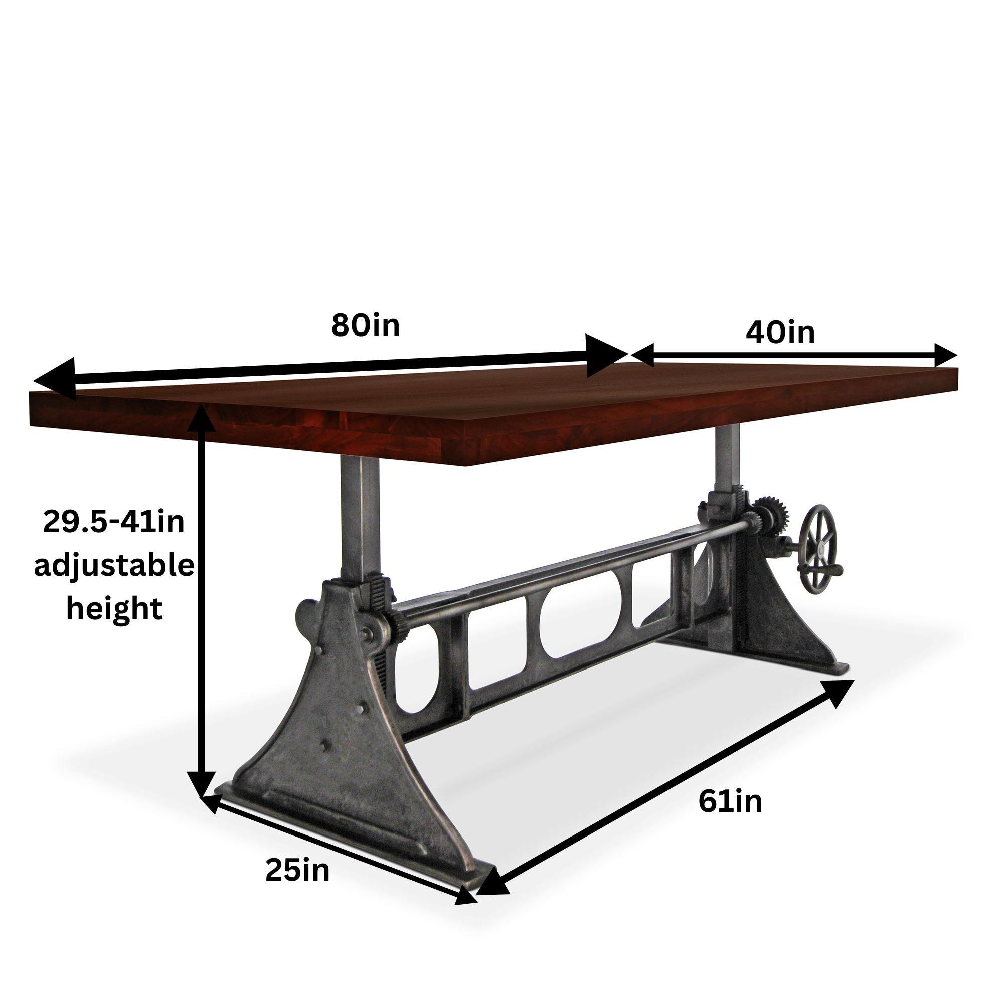 - Hand-cranked adjustable height solid cast iron and steel base with black-gray distressed matte finish.