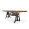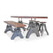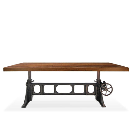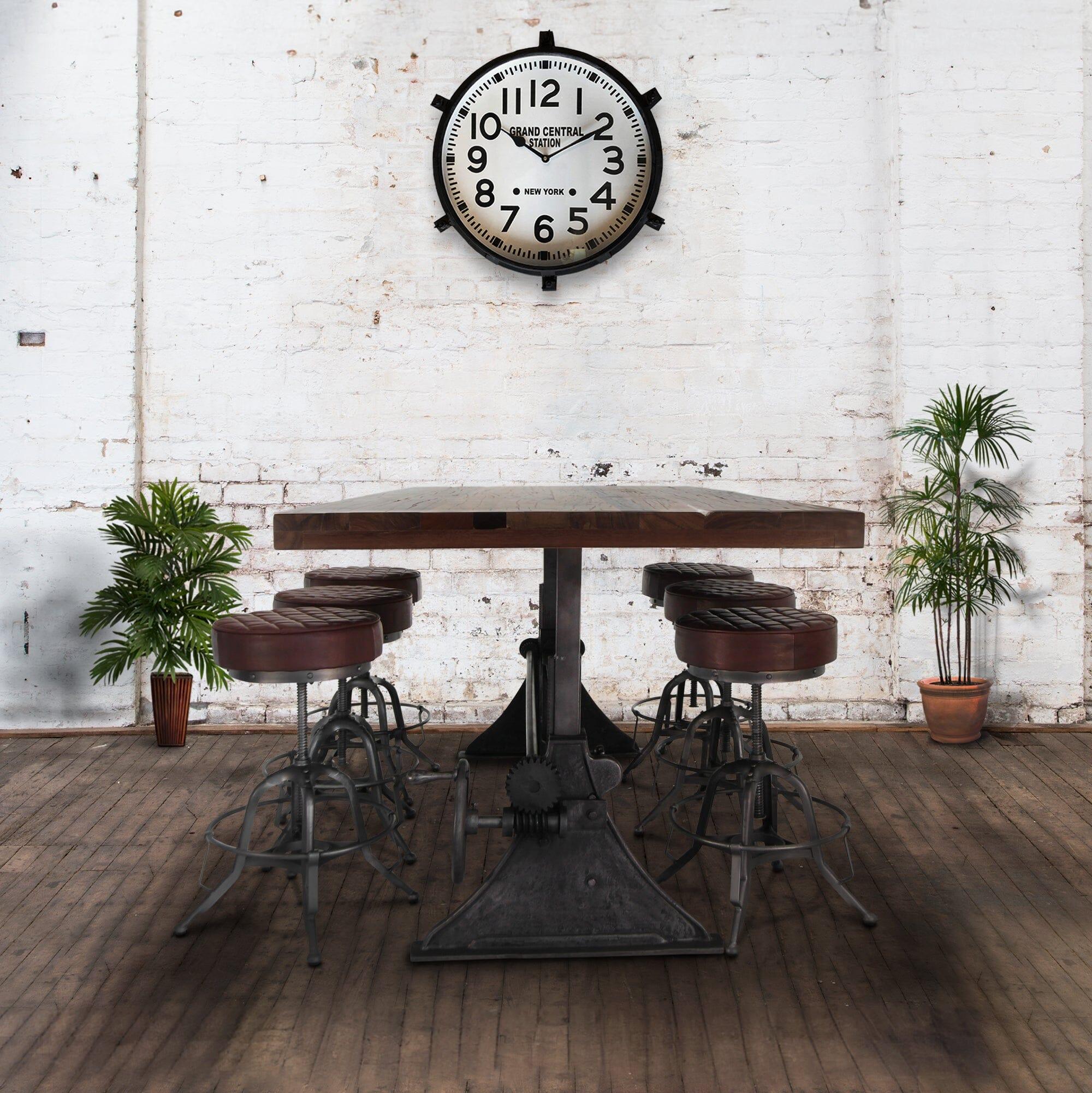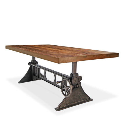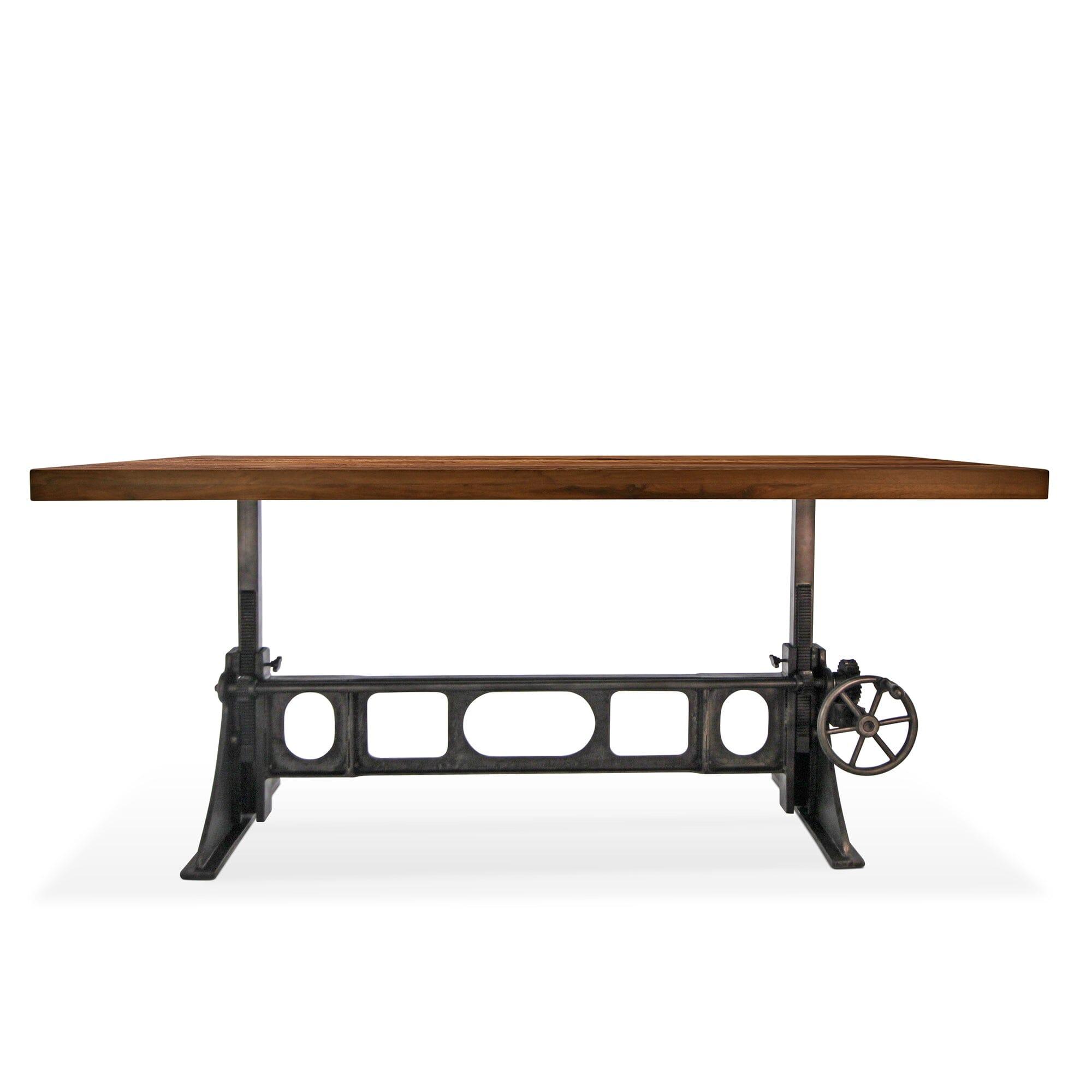 Cleverly designed, the vintage-style gearwork of this dining table embodies visual interest and industrial character. With an attractive curvature and smooth taper, this stylized triangular cast-iron base was inspired from the ancient Greek letter Delta, which is often used in engineering to symbolize changeability. The name is an excellent reflection of the versatile utility of this ergonomic sit-or-stand design. With a turn of the iron wheel, the spiral-helical gear mechanism smoothly adjusts the massive tabletop through an 11-inch range, from standard dining height to full bar height. The blackish distressed-iron finish of this base is amazing, further enhancing its mechanical character