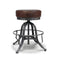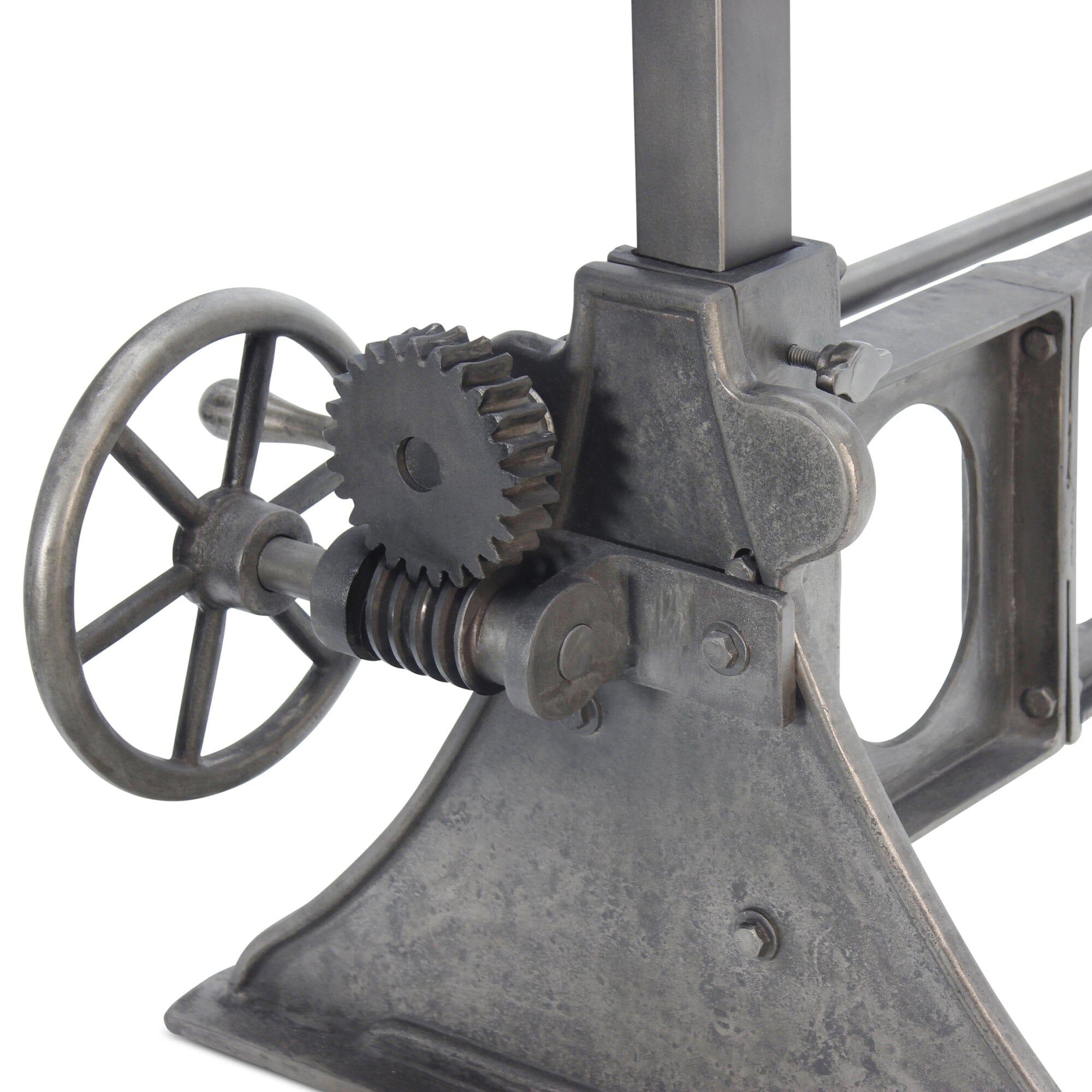 - Hand-cranked adjustable height solid cast iron and steel base with black-gray distressed matte finish.