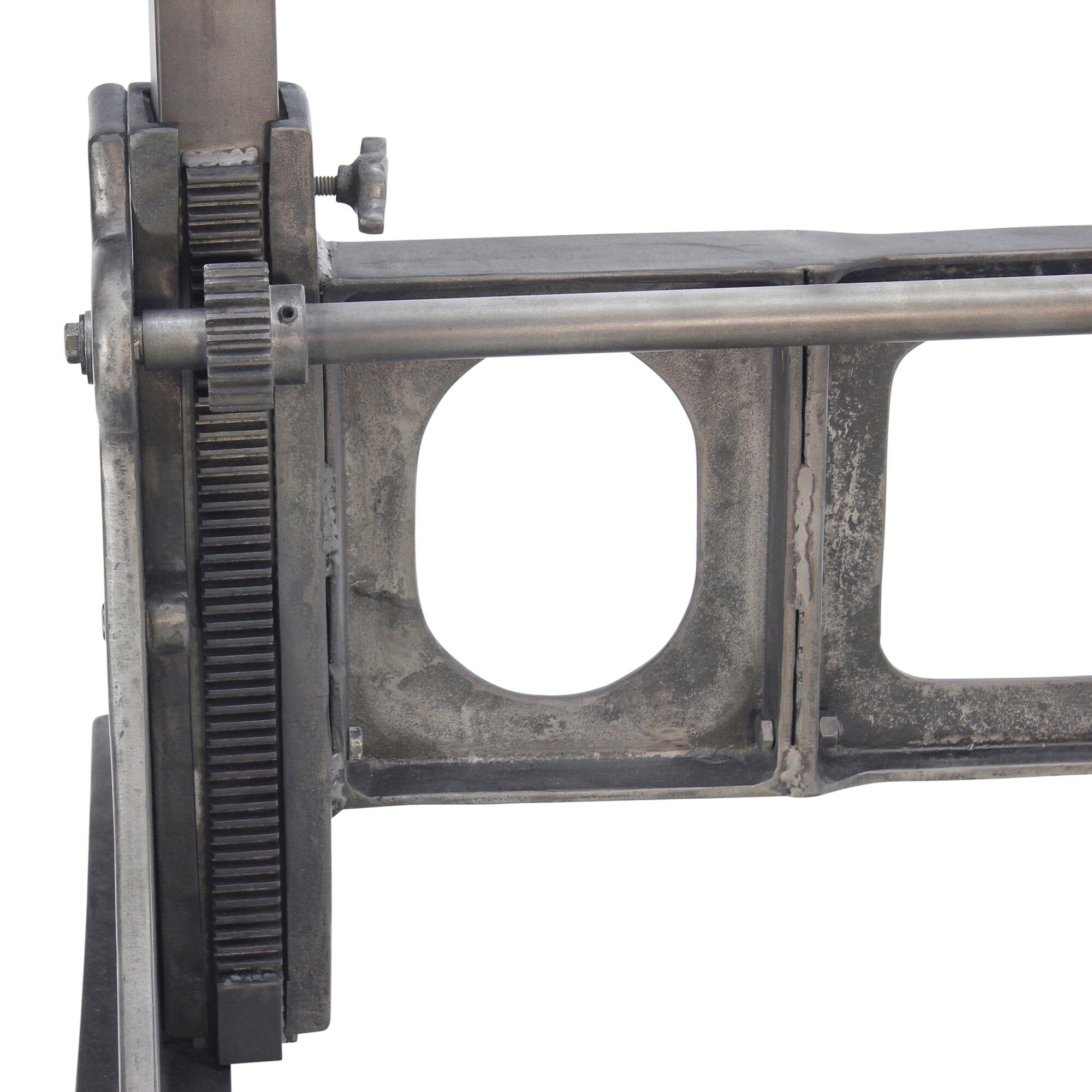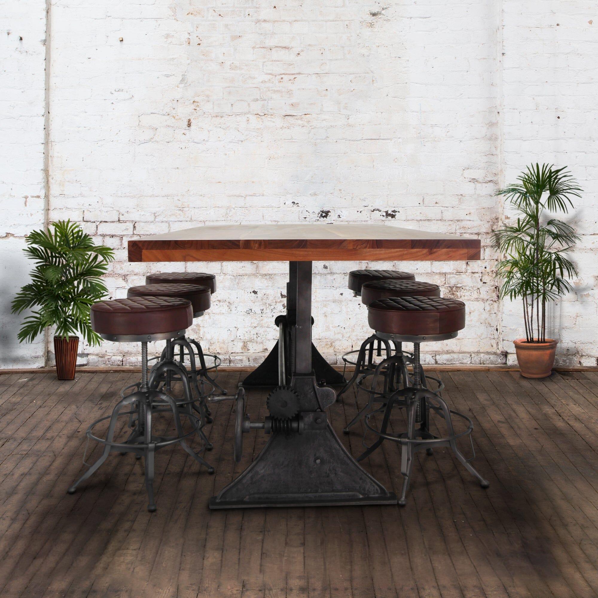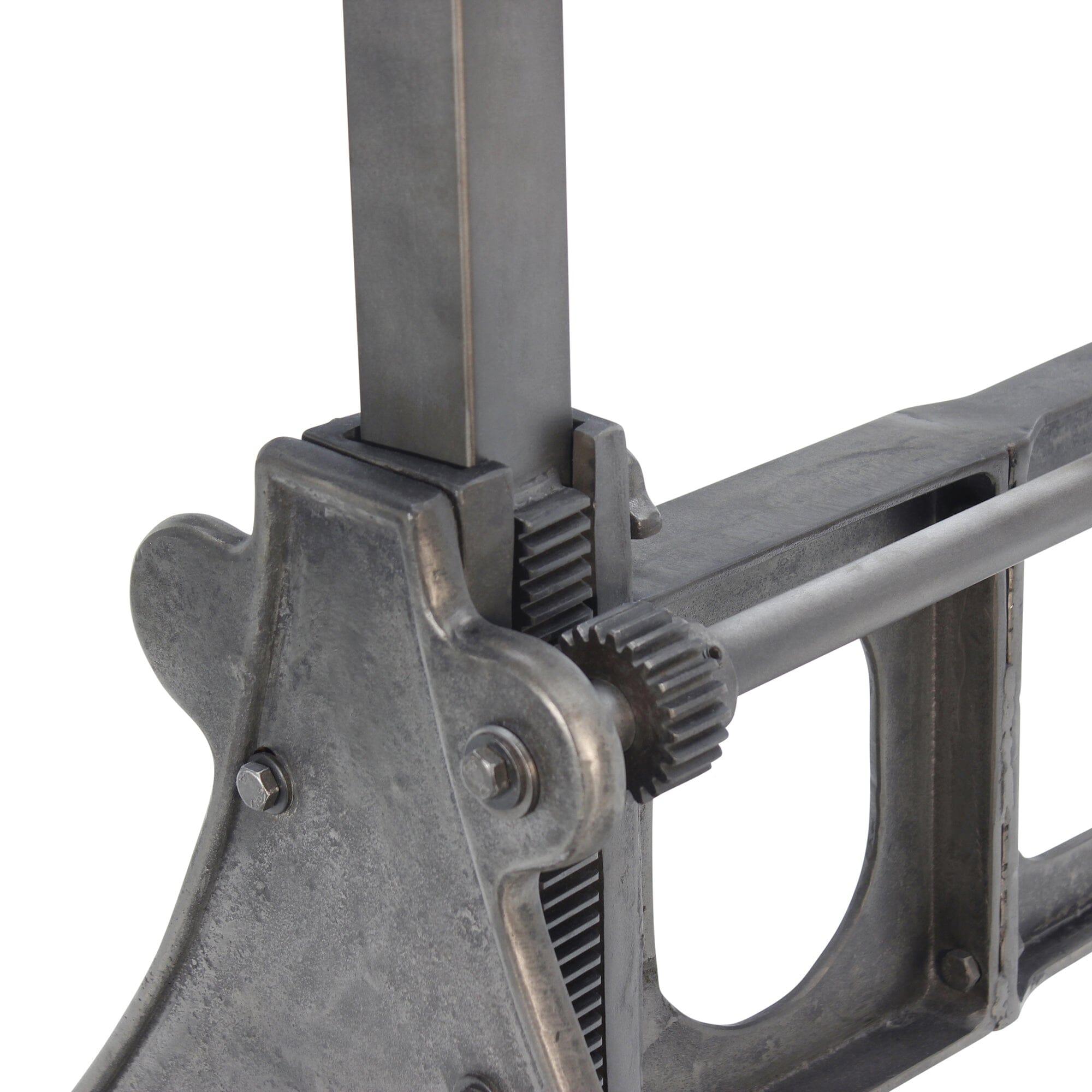 Cleverly designed, the vintage-style gearwork of this dining table embodies visual interest and industrial character. With an attractive curvature and smooth taper, this stylized triangular cast-iron base was inspired from the ancient Greek letter Delta, which is often used in engineering to symbolize changeability. The name is an excellent reflection of the versatile utility of this ergonomic sit-or-stand design. With a turn of the iron wheel, the spiral-helical gear mechanism smoothly adjusts through an 11-inch range, from standard dining height to full bar height.