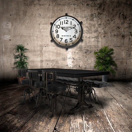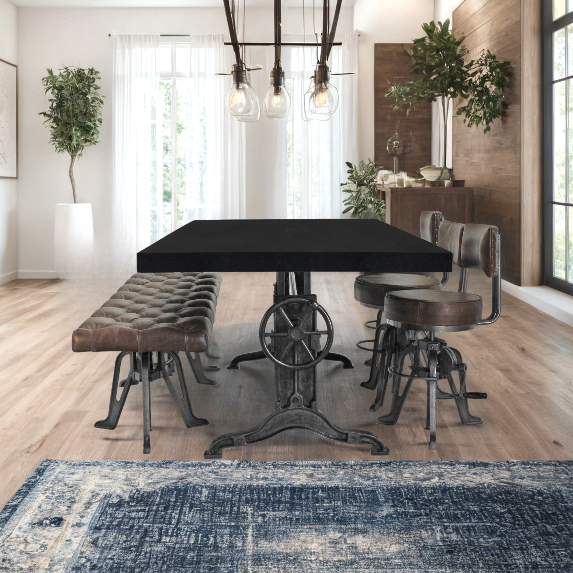 The Frederick industrial-style table features a heavy cast iron base that adjusts from standard dining height up to bar height. This very robust design is multi-functional as a dining table, pub table, counter height kitchen island, writing table, or desk. This elegant industrial base sits sturdily under a solid mango hardwood top with a healthy 2.5-inch-thick trim in a smooth ebony black finish.
