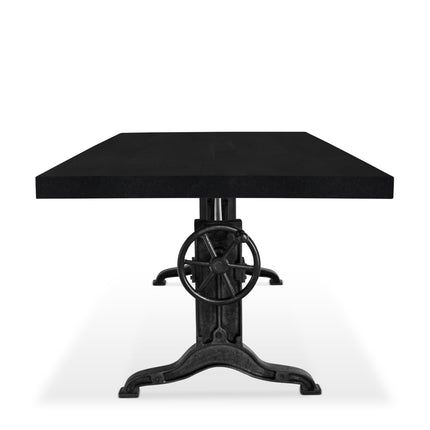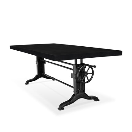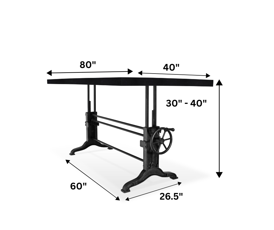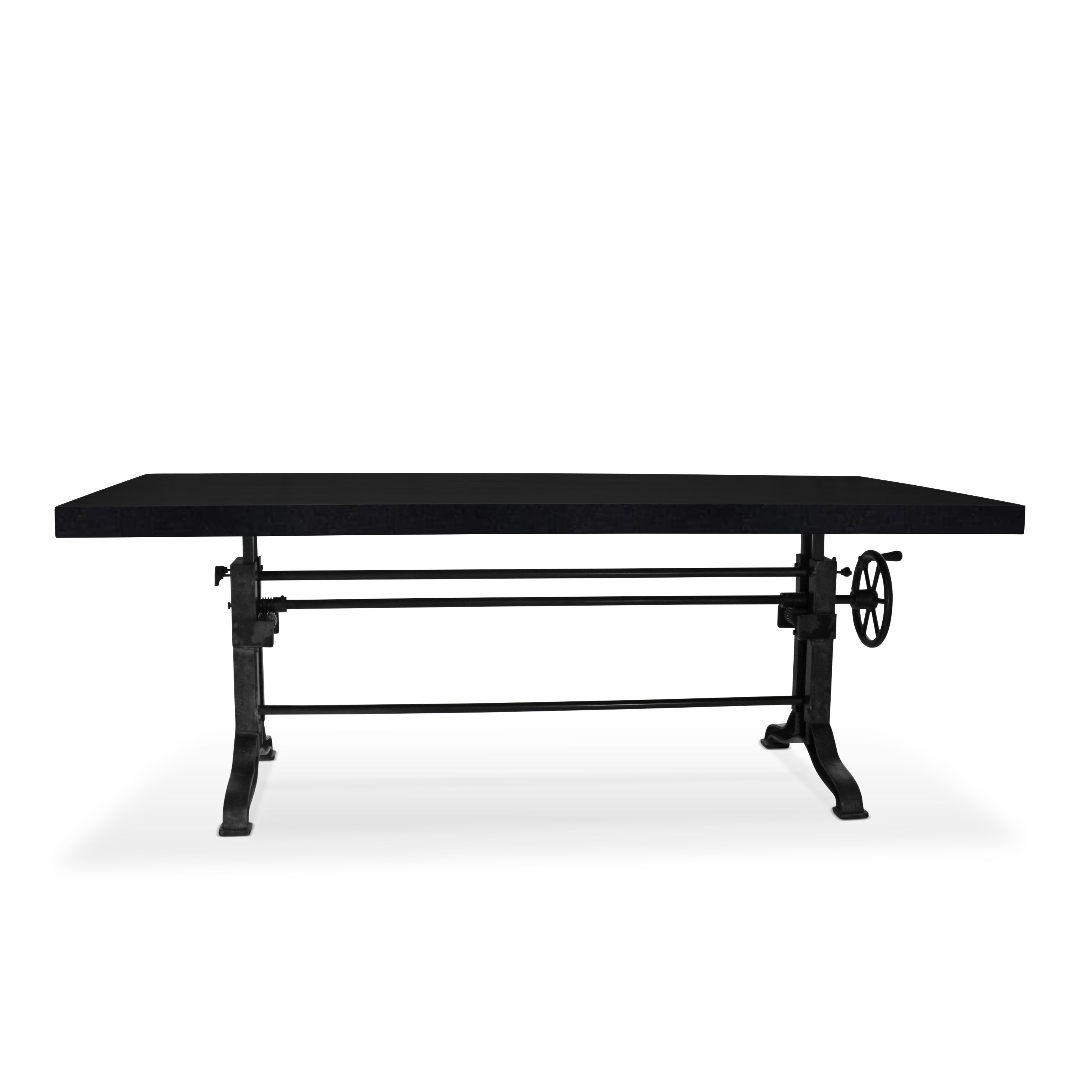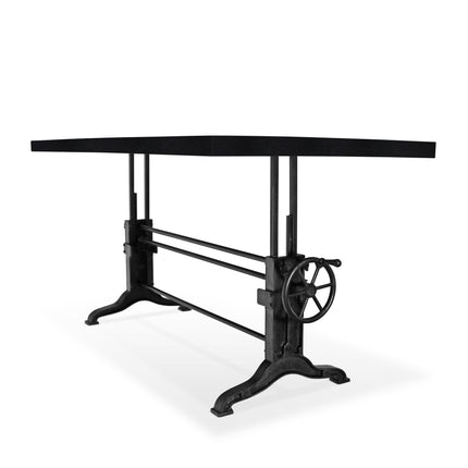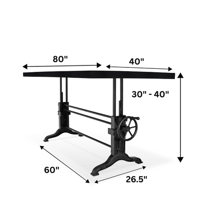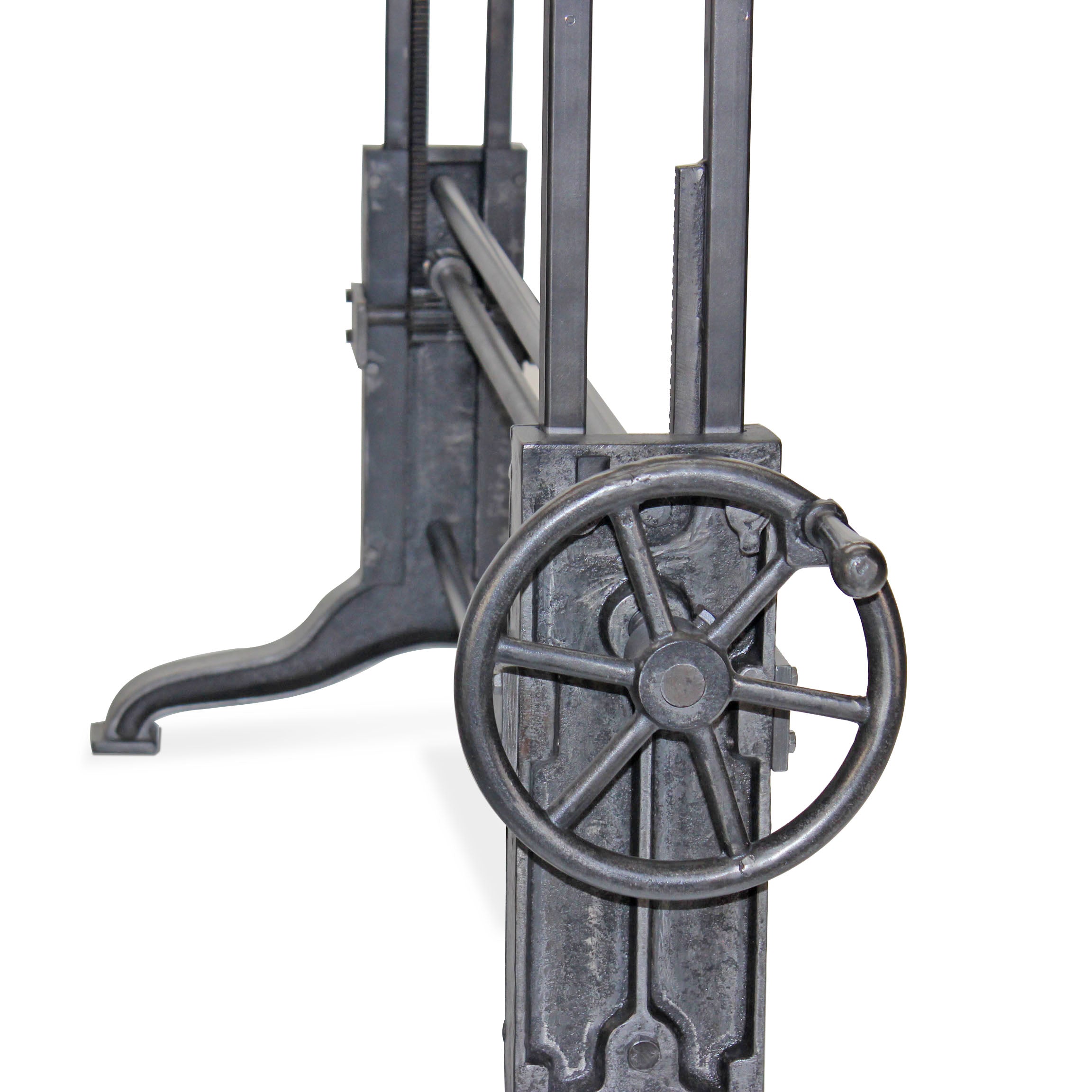 Inspired by the newspaper boon of the early 1800's, the Frederic table design is a unique mix of American Revival (curves of the base feet) and industrial machinery of that era (cast iron and crank wheel). This design takes its name from the Frederic Post Company located in Chicago, IL. The Frederick Post Company was a manufacturing leader of drafting tables and related factory workbenches during this period of US history.