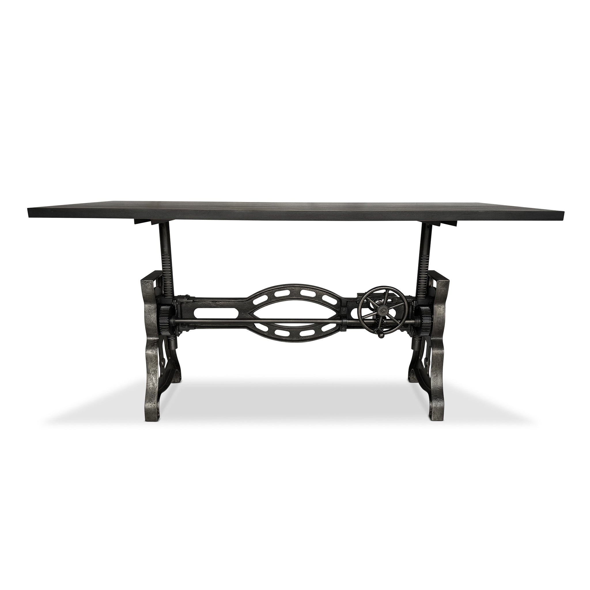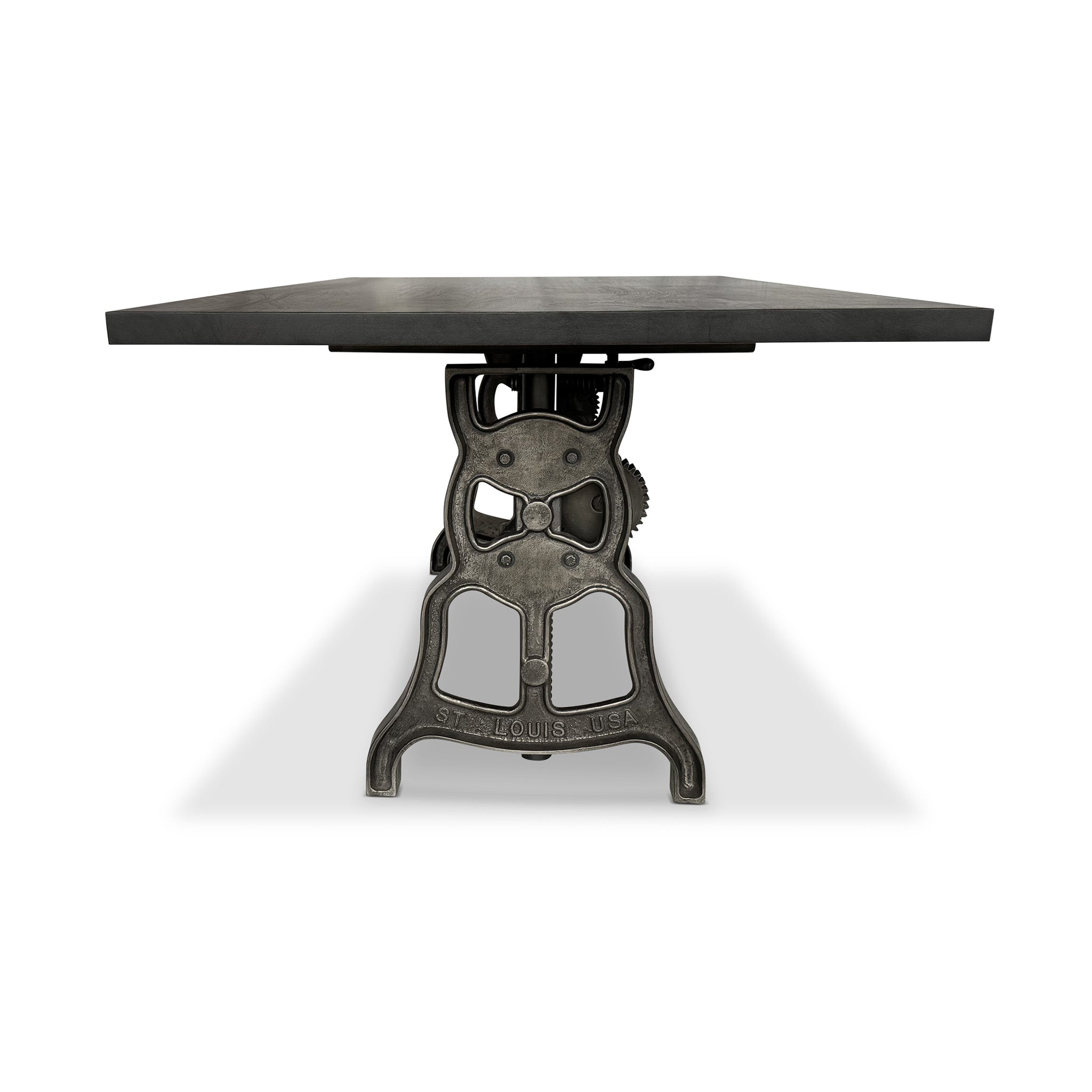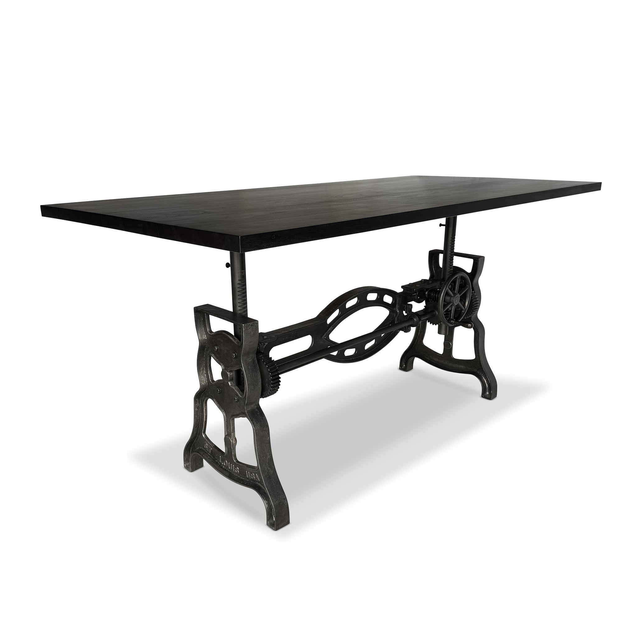 The Shoemaker industrial vintage style cast iron dining table base sits sturdily under a solid hardwood top with a 2.5-inch-thick frame. High-quality steel gears ensure a smooth adjustment of this tabletop through an impressive range of 13 inches. This dynamic flexibility gives the host many serving options, dining, counter or bar height.